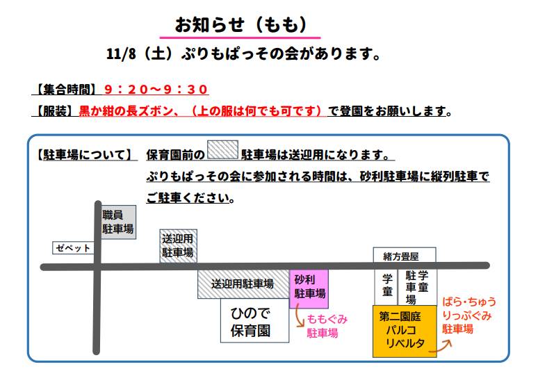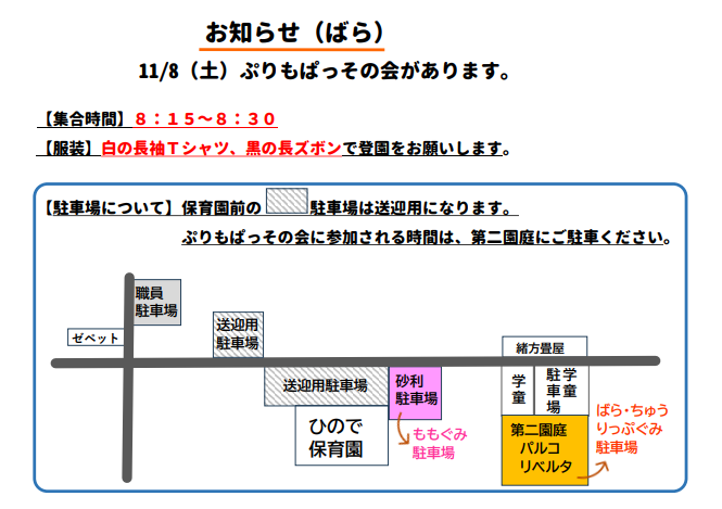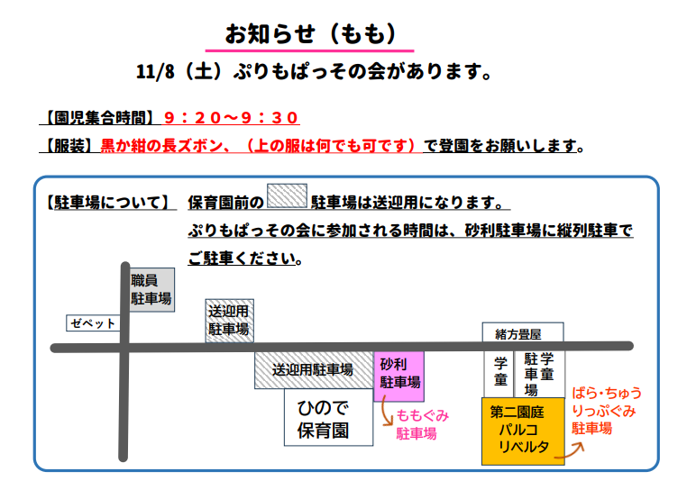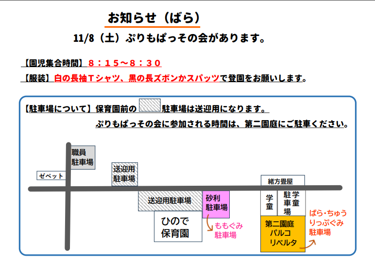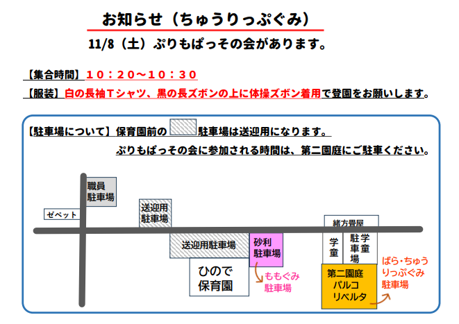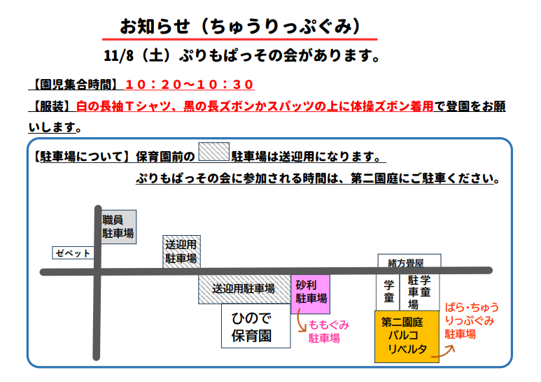 11月8日(土)ぷりもぱっその会についてのお知らせです(0.1.2歳児) 2025年11月7日 最終更新日時 : 2025年11月7日 hinode ☆子どもさんのクラスの内容をご確認ください。(集合時間・服装・駐車場・開始時間についてなど) 配布しましたプログラムは行事のお知らせのページにも掲載してあります 【🌷ちゅうりっぷぐみ】開始時間 11:00 ~ 11:45まで(園庭) 【🌹ばらぐみ】開始時間 9:00 ~ 9:45まで(アルバサーラ) 【🍑ももぐみ】開始時間 10:00 ~ 10:45まで(アルバサーラ) Follow me!